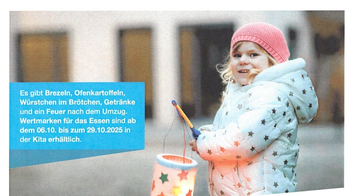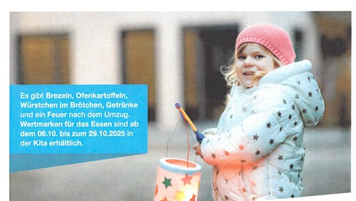 Es gibt Brezeln, Ofenkartoffeln, Würstchen im Brötchen, Getränke und ein Feuer nach dem Umzug. Wertmarken für das Essen sind ab dem 6.10. bis zum 29.10. in der Kita erhältlich.