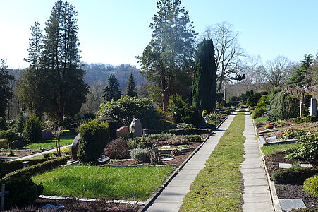 Mit unserem „Gotteswald“ bieten wir die Möglichkeit, sich naturnah bestatten zu lassen Hier kann pro Grabstelle eine Urne beigesetzt werden und die Ruhezeit beträgt 20 Jahre. Um jeden Baum werden maximal 6 Urnen beigesetzt. Bei Erwerb mehrerer Stellen sind diese verlängerbar und ihre Lage kann im speziellen Friedhofsfeld gewählt werden. Die Baumgräber haben eine einheitliche Gestaltung und werden von unseren Friedhofsmitarbeitenden gepflegt. Ein einheitlicher Grab-Liegestein ist vom Nutzungsberechtigten in Auftrag zu geben.